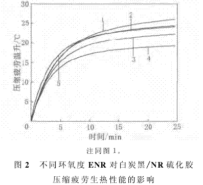 壓縮疲勞生熱是指硫化膠在負(fù)載、高頻的狀態(tài)下的溫升情況。不同環(huán)氧度ENR對白炭黑/NR硫化膠壓縮疲勞生熱性能的影響如圖2所示。