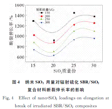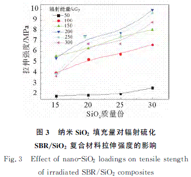 對(duì)于含有相同SiO2填充量的SBR/SiO2復(fù)合材料,隨輻射劑量增加,拉伸強(qiáng)度先增加,再減少。原因是,在SBR/SiO2復(fù)合材料的輻射過程中,交聯(lián)和降解反應(yīng)同時(shí)發(fā)生;輻射劑量低時(shí),交聯(lián)占主導(dǎo)地位,拉伸強(qiáng)度增加;輻射劑量較高時(shí),降解占主導(dǎo)地位,拉伸強(qiáng)度減小。從圖3所示的曲線變化趨勢(shì)看,輻射劑量為200kGy時(shí),各種SiO2填充量的SBR/SiO2復(fù)合材料的拉伸強(qiáng)度均較高。