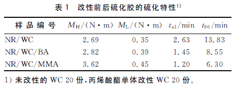 經丙烯酸酯單體接枝改性后的NR/WC/M復合材料硫化膠的硫化特性如表1所示。