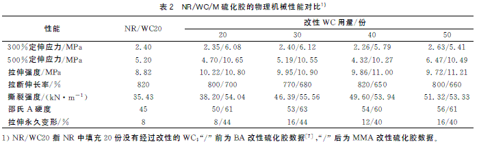 分別經BA和MMA單體改性的復合材料的硫化膠的物理機械性能如表2所示。
