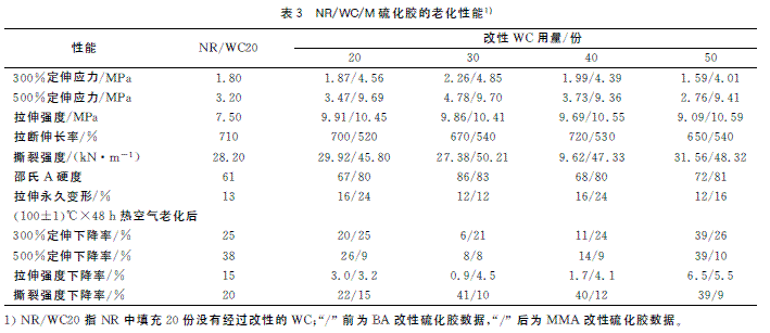 從表3可以看出,老化后的硫化膠性能都有所下降。但經過丙烯酸酯改性的硫化膠老化后性能下降率小于未改性的WC填充的硫化膠,尤其是500%定伸應力和拉伸強度下降率,比未改性的WC填充的硫化膠更小。這是因為丙烯酸酯類耐候性比較好,能提高硫化膠的耐老化性能。經MMA改性的硫化膠老化性能的下降率普遍小于經BA 改性的硫化膠,MMA 改性后的硫化膠的耐熱氧老化性能更好,這是由于MMA 的耐候性優(yōu)于BA的耐候性。