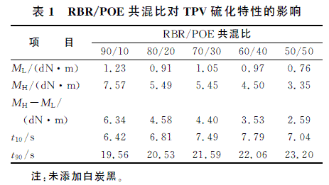 2.1 RBR/POE共混比對(duì)TPV硫化特性的影響RBR/POE共混比對(duì)RBR/POE TPV 硫化特性的影響如表1所示。