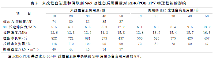 未改性及偶聯(lián)劑Si69改性白炭黑用量對(duì)RBR/POE TPV物理性能的影響如表2所示。