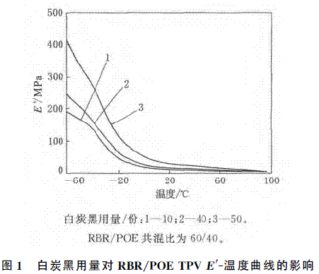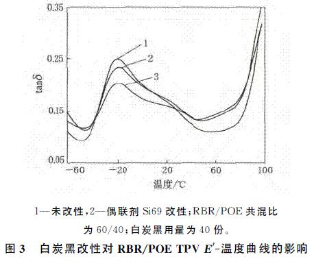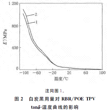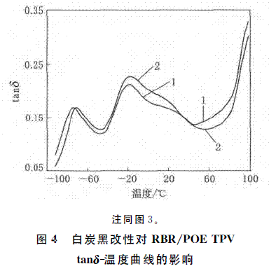 從圖2可以看出:-19℃左右的tanδ峰值表示POE的玻璃化溫度(Tg);白炭黑用量不同的TPV的Tg差別極小,說(shuō)明白炭黑用量對(duì)RBR/POE TPV的Tg影響很小。