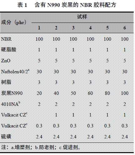 文中將含N990炭黑的丁腈橡膠膠料,與含N330炭黑的丁腈橡膠進(jìn)行膠料比較。為此,用不同品種炭黑制備了丁腈橡膠膠料,并按照標(biāo)準(zhǔn)測(cè)試方法對(duì)硫化膠進(jìn)行了試驗(yàn)。圍繞了性能測(cè)試結(jié)果進(jìn)行了討論,以確定可賦予橡膠膠料理想性能的適宜的炭黑品種。