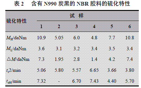 表2列示了N990炭黑填充丁腈橡膠膠料在150℃下的硫化特性:最大扭矩和最小扭矩(MH和ML),△扭矩差(DM,即最大扭矩和最小扭矩之差),焦燒時(shí)間(ts2),正硫化時(shí)間(tc90)。
