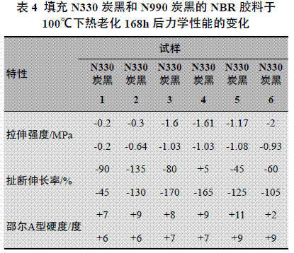 硬度由于炭黑填充量的增加而增大,這可以歸結(jié)于熱老化后交聯(lián)密度的提高。拉伸強(qiáng)度是交聯(lián)鍵的性質(zhì)和類型,交聯(lián)密度,彈性體的化學(xué)結(jié)構(gòu),以及與降解相關(guān)的變化的復(fù)合函數(shù)??梢钥闯觯?0份N330炭黑的試樣和含100份N990炭黑的試樣,表現(xiàn)出比其它試樣更好的耐老化性能。膠料拉斷伸長(zhǎng)率的變化隨炭黑含量的增加而減小,并隨著炭黑結(jié)構(gòu)度的提高而減小。