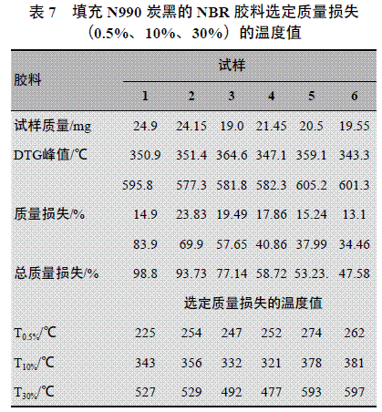 表7列示了質(zhì)量損失為0.5%、10%和30%時(shí)的初始分解溫度(IDT)。根據(jù)IDT (T0.5%)可以看出,含有80份N990炭黑的NBR膠料的穩(wěn)定性最好(274℃)。與N330炭黑填充丁腈橡膠相比,N990炭黑填充丁腈橡膠具有更低的IDT值。在質(zhì)量損失10%時(shí)填充量為100份的NBR/N990炭黑橡膠與填充量為60份的N330炭黑/NBR,試樣具有最高的溫度值(381℃和 373℃)。不過,當(dāng)質(zhì)量損失為30%時(shí),填充量為50份的NBR/N330炭黑橡膠與填充量為100份的NBR/N990炭黑橡膠比其它膠料更為穩(wěn)定。