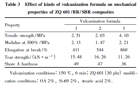 按照硫化配方1 所制備ZQ 601 /BR/SBR 復(fù)合材料的性能較差,對(duì)其進(jìn)行優(yōu)化改進(jìn)后采用配方2 和配方3( 參見表1) 進(jìn)行硫化,所得復(fù)合材料的力學(xué)性能見表3。由表3 可知,采用配方3 進(jìn)行硫化時(shí)復(fù)合材料的拉伸強(qiáng)度、300% 定伸應(yīng)力、邵爾A 硬度及撕裂強(qiáng)度分別達(dá)到了4. 10 MPa、2. 21 MPa、36 及11. 26 kN/m。由于對(duì)于輪胎用復(fù)合材料而言拉伸強(qiáng)度為重點(diǎn)考慮因素,因此以下試驗(yàn)均采用硫化配方3 進(jìn)行。