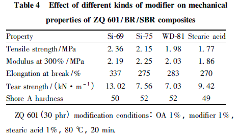 由表4 可知,改性劑對(duì)ZQ 601 /BR/SBR 復(fù)合材料的撕裂性能影響較大,4 種改性劑的優(yōu)良順序依次為Si - 69、硬脂酸、Si - 75 和WD - 81。采用Si - 69 改性白炭黑所填充復(fù)合材料的拉伸強(qiáng)度和撕裂強(qiáng)度分別為2. 36 MPa 和13. 02 kN/m,均為最優(yōu),因此確定所用改性劑為Si - 69。