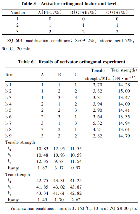 由于白炭黑的比表面積很大,在改性過程中需要的改性劑用量也非常大,導(dǎo)致改性成本較高,所以需要在添加改性劑之前添加一定量的改性助劑。試驗(yàn)中將PEG、CTAB 和OA 作為活化劑,通過1 組3 因素3 水平的正交試驗(yàn)來確定其適宜的種類,因素水平見表5,試驗(yàn)結(jié)果見表6。添加改性助劑一方面起到優(yōu)先通過物理化學(xué)反應(yīng)占據(jù)部分點(diǎn)位、增加相對(duì)分子質(zhì)量、減小比表面積的作用,另一方面起到調(diào)節(jié)pH 值、控制改性氣氛、活化改性劑的作用[8]。由表6 可知,對(duì)ZQ 601 /BR/SBR 復(fù)合材料拉伸強(qiáng)度的影響從大到小的順序依次為CTAB、PEG 及OA,最優(yōu)條件為A3B1C3,即用量為2%( 以白炭黑質(zhì)量計(jì),下同) 的PEG; 對(duì)膠料撕裂強(qiáng)度的影響從大到小的順序依次為OA、CTAB 及PEG,最優(yōu)條件為A3B1C2,即用量為2%的PEG 和1%的OA。由于撕裂強(qiáng)度的差異較小,所以主要考慮活化劑對(duì)拉伸強(qiáng)度的影響。最終確定活化劑選用A3B1C3,即用量同為2% 的PEG 和OA 作為最佳活化條件。在此條件下所得復(fù)合材料的拉伸強(qiáng)度達(dá)到5. 32 MPa,撕裂強(qiáng)度達(dá)到14. 94 kN/m。