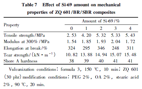 改性劑用量對(duì)ZQ 601 /BR/SBR 復(fù)合材料的性能有較大影響,在保證復(fù)合材料性能的同時(shí),也要考慮生產(chǎn)成本,因此試驗(yàn)中對(duì)改性劑Si - 69 的最佳用量進(jìn)行了探討,結(jié)果見表7。由表7 可知,隨著Si - 69 用量的增加,ZQ 601 /BR/SBR 復(fù)合材料的拉伸強(qiáng)度逐漸上升。在Si - 69 用量從0 增至2% 的過程中,拉伸強(qiáng)度增長(zhǎng)得較快,從2. 53 MPa增至5. 32 MPa,提高了110. 28%。再繼續(xù)增加Si - 69 用量,拉伸強(qiáng)度仍然持續(xù)上升,但是上升速率明顯減緩,可見當(dāng)Si - 69 用量為2%時(shí),白炭黑的表面改性效果較好。復(fù)合材料撕裂強(qiáng)度的變化趨勢(shì)與拉伸強(qiáng)度相類似。當(dāng)Si - 69用量為2%時(shí),復(fù)合材料的扯斷伸長(zhǎng)率最高,達(dá)到346%,硬度也較高。綜合分析Si - 69 的用量宜確定為2%。