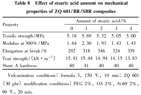 從表8 可知,硬脂酸用量對(duì)ZQ 601 /BR/SBR 復(fù)合材料的性能也有較大影響。硬脂酸用量為1% 時(shí),復(fù)合材料的拉伸強(qiáng)度為5. 69 MPa,撕裂強(qiáng)度為15. 44 kN/m,邵爾A 硬度為41,多項(xiàng)性能都較好。綜合考慮確定硬脂酸用量為1%。
