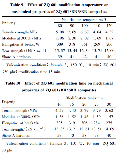 為了達(dá)到改性效果的最優(yōu)化,對(duì)改性溫度和改性時(shí)間進(jìn)行了考察。由表9 可知,當(dāng)改性溫度為100 ℃ 時(shí),ZQ 601 /BR/SBR 復(fù)合材料的拉伸強(qiáng)度為6. 67 MPa,扯斷伸長(zhǎng)率為361% ,撕裂強(qiáng)度為16. 34 kN/m,均為最優(yōu),綜合考慮確定改性溫度為100 ℃。由表10 可知,在100 ℃的改性溫度下,隨著改性時(shí)間的延長(zhǎng),ZQ 601 /BR/SBR 復(fù)合材料的的拉伸強(qiáng)度和扯斷伸長(zhǎng)率逐漸下降,其他性能的變化趨勢(shì)不明顯??紤]到改性過程中添加了液體藥劑,改性時(shí)間進(jìn)一步縮短會(huì)導(dǎo)致粉體團(tuán)聚現(xiàn)象嚴(yán)重,所以適宜的改性時(shí)間定為10 min。