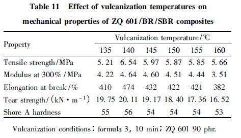 在ZQ 601 的最佳改性條件下,研究硫化溫度對(duì)ZQ 601 /BR/SBR 復(fù)合材料性能的影響,結(jié)果見表11。由表11 可知,復(fù)合材料的拉伸強(qiáng)度、300%定伸應(yīng)力、扯斷伸長(zhǎng)率、撕裂強(qiáng)度及硬度均隨著硫化溫度的升高而先上升后下降。當(dāng)硫化溫度為140 ℃時(shí),其拉伸強(qiáng)度、300%定伸應(yīng)力、扯斷伸長(zhǎng)率、撕裂強(qiáng)度及邵爾A 硬度分別達(dá)到了6. 54 MPa、4. 64 MPa、474%、20. 11 kN/m 及56,效果較好。綜合考慮確定硫化溫度為140 ℃。