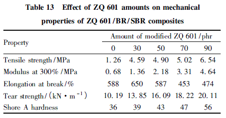 c) 在最佳的改性和硫化方案下,ZQ 601 /BR/SBR 復(fù)合材料的拉伸強(qiáng)度、扯斷伸長(zhǎng)率、撕裂強(qiáng)度及邵爾A 硬度分別達(dá)到了6. 54 MPa、474%、20. 11 kN/m 和56,符合農(nóng)業(yè)用輪胎及墊帶的國標(biāo)要求( 拉伸強(qiáng)度不小于6. 5 MPa,扯斷伸長(zhǎng)率不小于350%) 。