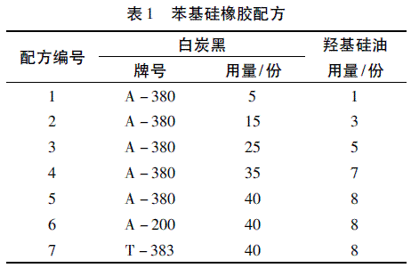 苯基硅橡膠: 120 - 1,摩爾質(zhì)量65 × 104 ~70 × 104 g /mol,苯基質(zhì)量分數(shù)4% ~ 5%,上海樹脂廠; 氣相法白炭黑: A380、A200,贏創(chuàng)德固賽( 中國) 投資有限公司; 沉淀法白炭黑:T383,法國羅地亞公司; 羥基硅油: GY209,運動黏度4 000 mm2 /s,中昊晨光化工研究院; 1,4- 二叔丁基過氧化異丙基苯( BIPB) : 寧波協(xié)進化工有限公司。