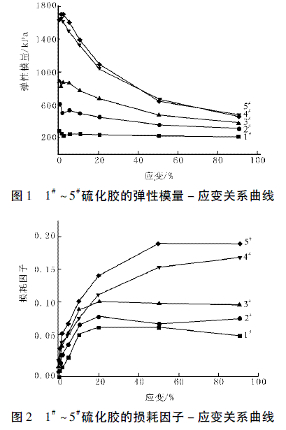 從圖2 可以看出,相同應(yīng)變下,隨著白炭黑用量的增大,苯基硅橡膠的損耗因子依次遞增; 隨應(yīng)變的增加,苯基硅橡膠的損耗因子呈上升趨勢。羥基硅油與白炭黑的質(zhì)量比是1∶ 5。當苯基硅橡膠中白炭黑的用量達到一定程度時便會形成附聚體網(wǎng)絡(luò),這種附聚體網(wǎng)絡(luò)密度很大,需要吸入很多能量方能打破[4 - 5]; 同時苯基硅橡膠大分子與白炭黑形成了凝膠網(wǎng)絡(luò),也需要吸收能量方能打破。1# ~ 3#樣品中白炭黑加入量不足以形成附聚體網(wǎng)絡(luò)和凝膠網(wǎng)絡(luò),所以彈性模量隨應(yīng)變的增大變化不明顯; 而4# 和5# 樣品中白炭黑的加入量較多,形成了附聚體網(wǎng)絡(luò)和凝膠網(wǎng)絡(luò),施加應(yīng)變破壞了網(wǎng)絡(luò)結(jié)構(gòu),所以彈性模量隨應(yīng)變增大而迅速下降。兩種網(wǎng)絡(luò)結(jié)構(gòu)被破壞時會消耗能量導致?lián)p耗因子增加; 另外形變過程中分子鏈沿剪切方向運動,大體積的苯基有更高的位阻,分子間的摩擦也隨之增加[6],這些均會導致?lián)p耗因子增大。