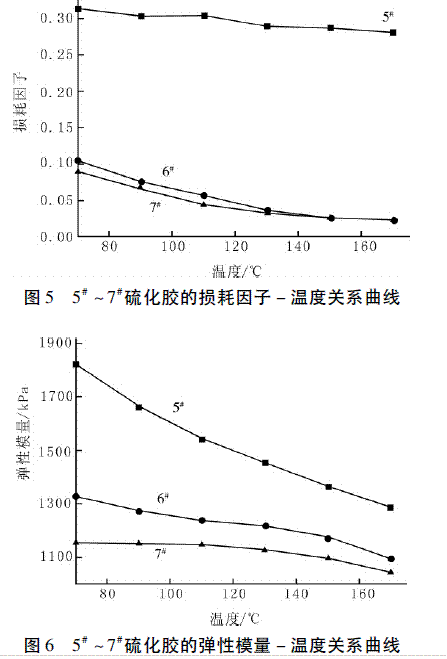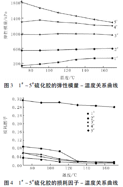 在不同應(yīng)變下,隨著應(yīng)變的增加,苯基硅橡膠硫化膠的彈性模量逐漸減小,損耗因子逐漸增大; 在相同應(yīng)變下,隨著白炭黑用量的增多,苯基硅橡膠硫化膠的彈性模量和損耗因子增大。在不同溫度下,白炭黑用量不同的苯基硅橡膠硫化膠的彈性模量和損耗因子在70 ~ 170℃范圍內(nèi)變化不明顯; 隨著白炭黑粒徑的減少,苯基硅橡膠的彈性模量和損耗因子增大,細粒徑白炭黑的補強效果比粗粒徑白炭黑好。