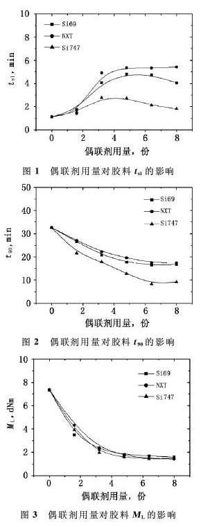 1)偶聯(lián)劑NXT具有較好的抗焦燒性能,在偶聯(lián)劑用量較高時這種優(yōu)勢更加明顯,3種偶聯(lián)劑抗焦燒能力的順序為:NXT>Si69>Si747。