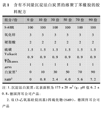 用白炭黑(有、無(wú)硅烷偶聯(lián)劑Si69)填充的溶聚丁苯橡膠,試樣配方示于表1。