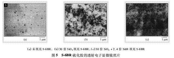 純S-SBR、含30份SiO2(有、無(wú)Si69)膠料的照片分別見(jiàn)圖5。照片中的黑色部分代表SiO2粒子和純?cè)嚇又械腪nO。這些照片清楚表明,由于白炭黑與S-SBR基質(zhì)之間的相互作用,白炭黑的分散良好。另外,有、無(wú)Si69的白炭黑填充試樣之間幾乎沒(méi)有差別。這些研究證實(shí)了力學(xué)測(cè)試結(jié)果,因?yàn)榧尤隨i69后只發(fā)現(xiàn)有較小的差別。