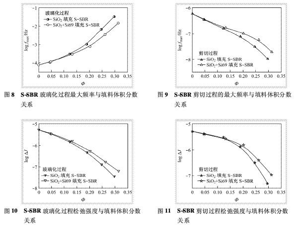 由圖8和圖9可以看出,隨著白炭黑含量的增加,玻璃化過(guò)程的fmax向高頻方向移動(dòng),而剪切過(guò)程則隨填料含量的增加向較低頻方向移動(dòng)。含Si69膠料的玻璃化過(guò)程的fmax值比不含Si69膠的低,而含Si69試樣的剪切過(guò)程的fmax較高。