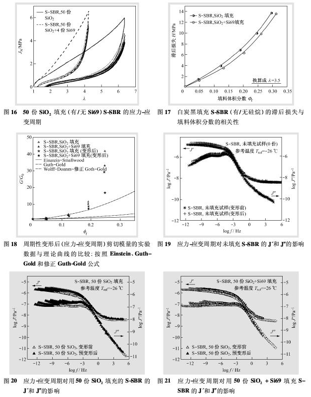 在應(yīng)力-應(yīng)變周期性實(shí)驗(yàn)結(jié)束后立即測(cè)量J’和J″,結(jié)果示于圖19~21。從這些圖可以看出,盡管變形不會(huì)改變未填充試樣的J’和J″值,但填充橡膠的值增大。1950年P(guān)ayne觀察到這一現(xiàn)象,如前所述,在較高應(yīng)力幅度下的結(jié)果證實(shí)了這一現(xiàn)象。此外,與不含Si69的試樣相比,由Si69對(duì)白炭黑進(jìn)行表面改性的試樣要軟一些,這可能是因?yàn)榘滋亢诠柰榛蟾邩O性的硅烷醇基團(tuán)數(shù)量減少,而且填料表面與聚合物間的偶聯(lián)反應(yīng)增加了結(jié)合橡膠的含量之故。硅烷化還能阻止填料聚集體的聚集,膠料的總體黏度要低于未硅烷化的膠料,因?yàn)樘盍暇W(wǎng)絡(luò)大幅減少了。