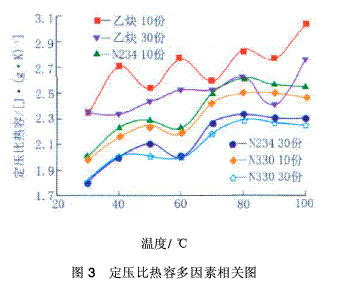 從圖3可以看出,3種炭黑橡膠體系的定壓比熱容均隨溫度的升高而略提高,隨著炭黑用量的增加而降低。乙炔炭黑橡膠體系的定壓比熱容最大,不同于熱擴(kuò)散系數(shù)和導(dǎo)熱系數(shù)的規(guī)律,N234炭黑橡膠體系的定壓比熱容在10份和30份時(shí)均優(yōu)于N330。隨著溫度的升高,3種炭黑膠料因其用量的增加而定壓比熱容提高的幅度沒(méi)有很大變化。