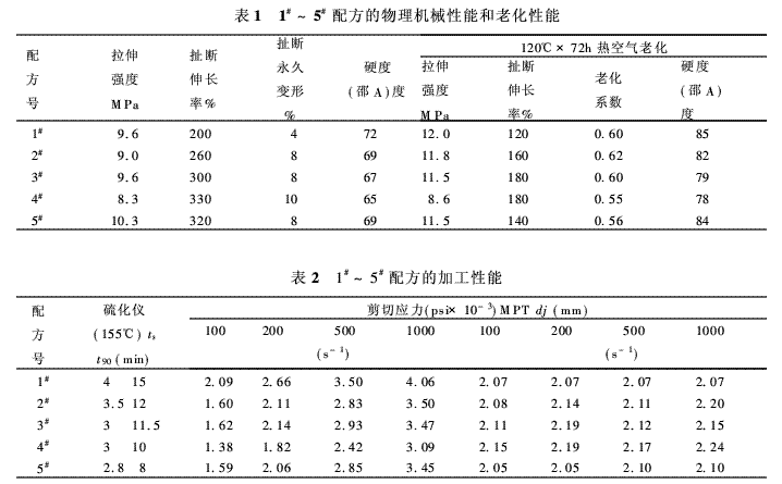表2列出了1#~5#配方的加工性能,可見SRF、GPF有比FEF更短的焦燒時(shí)間t10和更快的硫化速度(t90),更好的擠出流動(dòng)性(同樣剪切速率下的剪切應(yīng)力小)及更大的擠出物膨大,這也就同SRF,GPF粒子大小比FEF大,結(jié)構(gòu)不及FEF高相吻合。