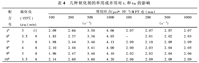表4數(shù)據(jù)亦清楚表明,這幾種軟化劑的單用或并用,對(duì)硫化特性ts與t90影響亦不大,僅單用機(jī)油者t90長(zhǎng)些;對(duì)擠出流動(dòng)性與擠出物膨大,幾乎沒有影響,可以互換使用。除上述實(shí)驗(yàn)結(jié)果外,亦已有試驗(yàn)表明,這些配方的膠料,汽油抹凈表面之后,稍加壓力貼合,經(jīng)硫化缸直接蒸汽硫化,除7#可用手撕開之外,上述配方皆可牢固粘合(手撕不能撕剝開),則具有好的成型自粘性。