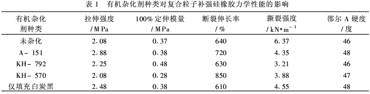 表1是有機(jī)雜化劑種類對(duì)復(fù)合粒子補(bǔ)強(qiáng)硅橡膠力學(xué)性能的影響。