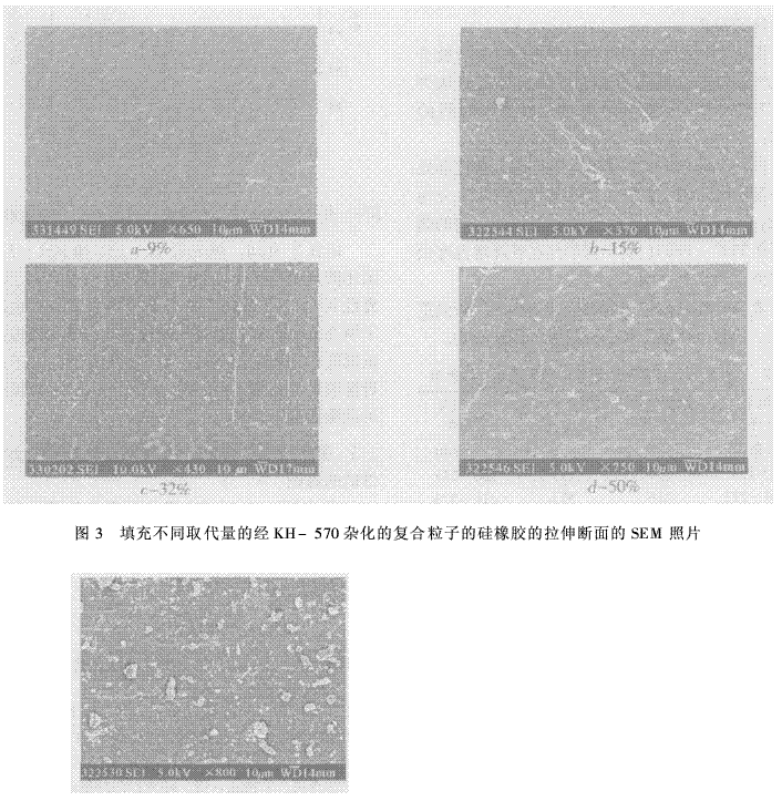 圖3是填充不同取代量的經(jīng)KH-570雜化的復(fù)合粒子的硅橡膠的拉伸斷面的SEM照片。從圖3可以看出,隨復(fù)合粒子取代量的增加,復(fù)合粒子在硅橡膠中的分散性變差,不僅大顆粒的數(shù)目有增加的趨勢(shì),而且粒徑分布也變寬。需要指出的是,復(fù)合粒子的取代量為9%時(shí),其SEM照片中只有為數(shù)不多的幾個(gè)尺寸較大的粒子,與氣相法白炭黑補(bǔ)強(qiáng)的硅橡膠相比(圖4),分散性能得到明顯改善,這也是復(fù)合粒子的取代量為9%時(shí)硅橡膠的力學(xué)性能優(yōu)于純氣相法白炭黑補(bǔ)強(qiáng)硅橡膠的原因。