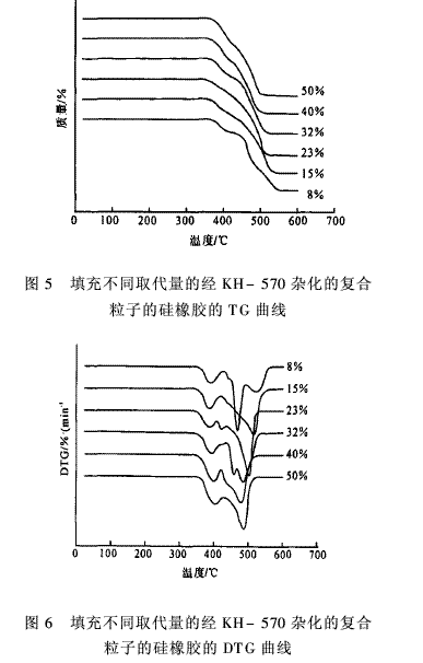 圖5、圖6分別是填充不同取代量的經(jīng)KH-570雜化的復(fù)合粒子的硅橡膠的TG和DTG曲線。