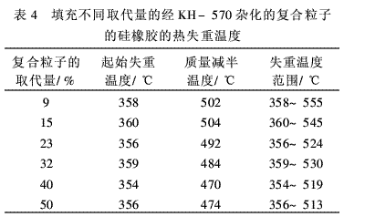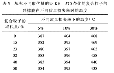 填充不同取代量的經(jīng)KH-570雜化的復(fù)合粒子的硅橡膠在不同質(zhì)量損失率時(shí)所對(duì)應(yīng)的溫度列于表5,表5能夠更精細(xì)地反映硅橡膠的耐熱性能。