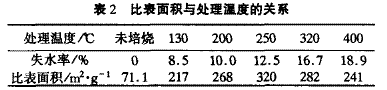 由表2可知,隨著處理溫度的升高,凹土失水率增加,而比表面積開始隨著溫度升高而增大,到250℃左右達(dá)到最大值,以后隨著溫度的繼續(xù)上升反而降低,這可能是由于凹土脫水時通道塌陷造成的。故250℃溫度下焙燒2h的熱處理條件對脫除水分,增大比表面積較為有利。以后實(shí)驗所用的凹土均指在此條件下熱處理后的活性凹土。