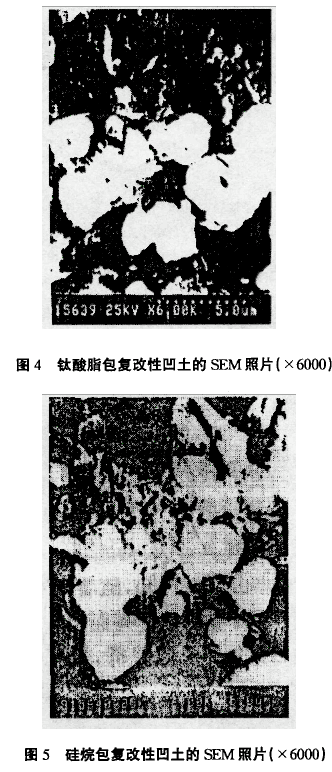 凹土填料的包復(fù)效果,采用日本日立公司S - 570型掃描電鏡(SEM)進(jìn)行測試,如下圖2,3,4,5所示。