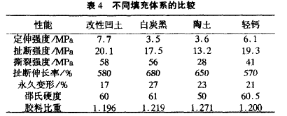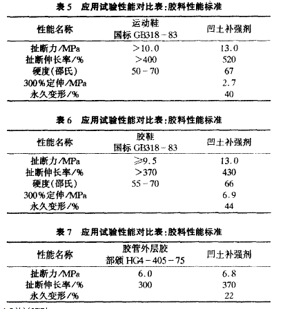 凹土補(bǔ)強(qiáng)劑對天然及合成橡膠有很好的補(bǔ)強(qiáng)性,它在膠料中具有良好的相容性、浸潤性和分散性,膠料硫化平坦性好,在橡膠制品行業(yè)中替代炭黑或白炭黑所生產(chǎn)的膠管、膠帶、膠鞋等理化性能均達(dá)到國家標(biāo)準(zhǔn);見表5,6,7。也可用于生產(chǎn)淺色或彩色橡膠制品。