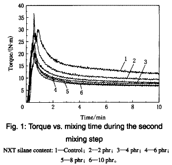 所用配方如下:橡膠100,白炭黑50,防老劑2, Zn0-80 4, SA 2, DPG-80 2, CZ-802, 5-80 2,硅烷NXT變量(0-10 phr)。在開煉機和Haake流變儀上進行混煉。首先將橡膠、白炭黑和硅烷NXT在50℃開煉機上混煉;然后,在150℃、轉(zhuǎn)速為30 r·min-1下在Haake上混煉10min。最后在開煉機上加人剩余的助劑,混煉均勻出片。