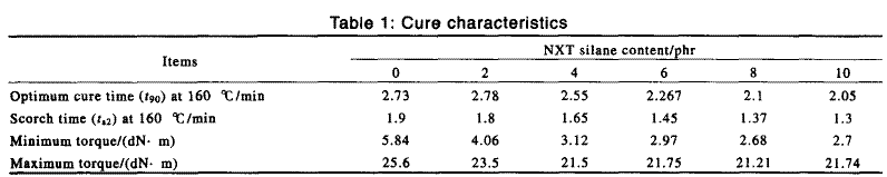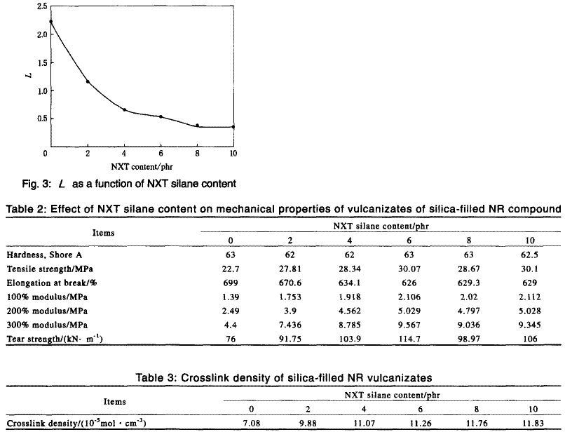 隨著硅烷NXT含量的增大混合平衡時混煉膠的扭矩降低;隨著硅烷NXT用量的增大,混煉膠的焦燒時間和正硫化時間縮短;加人硅烷NXT提高了白炭黑增強NR的硫化膠的力學(xué)性能,如模量、拉伸強度以及撕裂強度等;NR硫化膠的交聯(lián)密度隨著硅烷NXT含量的增大而增大,硫化膠的拉斷伸長率隨著膠料中硅烷NXT含量的增大而變小。加人硅烷NXT后,硫化膠在60℃的tanδ值變小,而在0℃的tanδ值則變大。加人硅烷NXT,降低了NR硫化膠的滾動阻力,同時也提高了硫化膠的抗?jié)窕阅堋?/p>