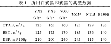 對于初步的分析,分別采用了炭黑CoraxN115和Ecorax1990,以及白炭黑UlrasiVN2GR,Ulrasil 7000GR和Ulrasil 7005(微粒)典型分析數據示于表1。白炭黑的比表面積,炭黑膠料與炭黑/白炭黑膠料間的基本差異是本研究的主題。