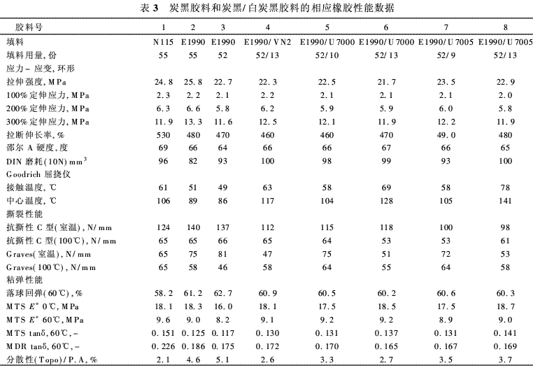 表3中的膠料1~3是純炭黑膠料,作為對比膠料。調整膠料5和膠料7的填料填充量,使添加到橡膠料中的白炭黑的總表面積保持不變(膠料4為參照膠料)。在膠料4、膠料6和膠料8中,炭黑和白炭黑的填料填充量保持恒定。