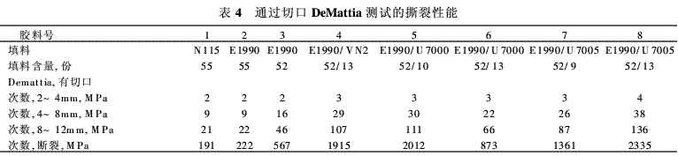 5)對于生熱(調整白炭黑的填充量,膠料4、膠料5、膠料7),U7000GR和U7005的生熱處于完全相同的水平,與VN 2 GR相比其水平更低。關于標準橡膠試驗,唯一能夠看出的明顯差異與生熱有關。撕裂的差異可看出,但并不顯著。另外,對于上述的撕裂試驗,也可用有切口的DeMattia測試來檢驗撕裂性能。進行該測試了解到可能表現出很劇烈的變化,所以不應該考慮每個單一的值,而只應該推測大致的趨勢。表4列出了有關抗撕裂性行為DeMattia測試所獲得的數據。