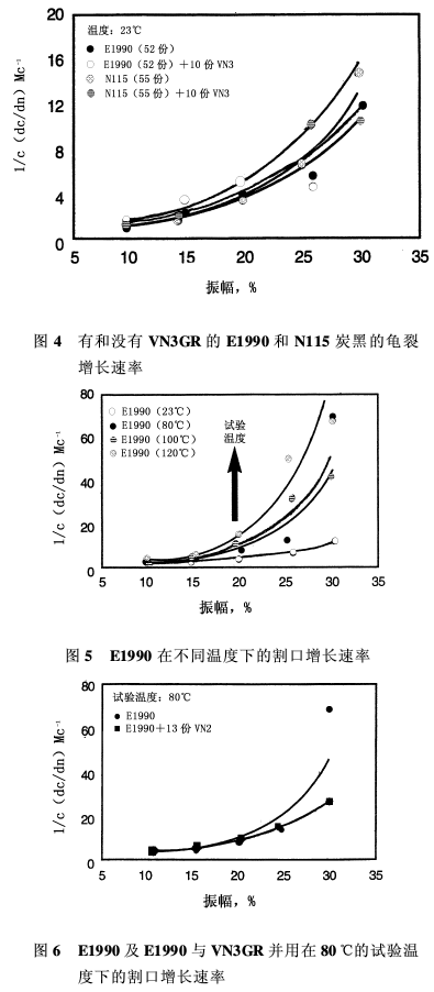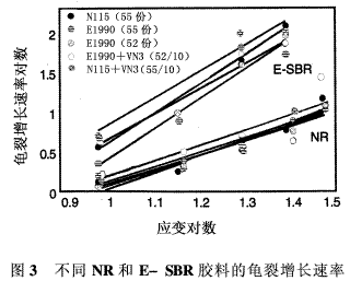 圖3示出了不同NR膠料和E-SBR膠料的對數龜裂增長速率與對數變形幅度的關系,測試溫度為23℃。從圖中可非常清楚地看到,所有的NR膠料其龜裂增長速率低于E-SBR膠料,這在圖3中無法很精確地量度不同填料對抗撕裂性能的影響,即便使用撕裂分析儀也是如此。觀察一下E-SBR膠料可發(fā)現,E1990在填充量為5份時其割口增長方面的性能達到最佳,其次是E1990在填充量為52份時。添加白炭黑會使其大為惡化。在NR膠料中,E1990與VN 3 GR(填料配合比為52/10份)的并用膠是唯一被注意到呈現出消極情形者,這再一次印證了白炭黑并用的惡劣性能。這些結果與Graves試驗獲得的結果相矛盾,這在實踐當中已經廣為人知。為了能容易地辨別測定結果的波動和各種膠料之間的差異,以下采用龜裂增長速率和應變的線性圖,而不是采用雙對數曲線圖。圖4描繪出了填充E1990和N115的兩種純炭黑膠料,以及填充10份VN 3 GR的對應膠料的情況。后面進行的研究都以天然橡膠作為聚合物。