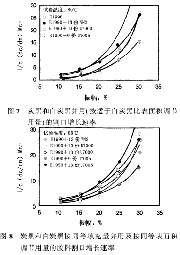 在圖6中,與純炭黑膠料相比較,炭黑和白炭黑的并用膠可觀察到抗撕裂性能行為的改善。然而,必須注意到:只有當變形幅度超過25%時才能看到這樣的差別,此種場合還可觀察到更高的測定結果變化。兩種膠料之間的差異不是更多,可能是由于這一事實:在膠料中除了炭黑外還添加了白炭黑,因而總的填充量合計為68份而非55份。在實踐當中,炭黑的份額應該隨著添加的白炭黑而減少。不過,在這些研究中并未考慮這樣的配合。