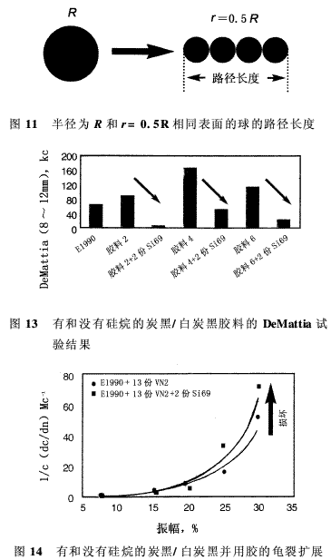 在這幅圖中能清楚地看出HSA-白炭黑與LSA-白炭黑相比的優(yōu)勢。對于撕裂性能的判斷,現在有可能考慮由固特里奇屈撓測定儀測量出的膠料的特定生熱。這樣便可以測定割口增長速率與在明確的條件下測得的生熱之間的關系。將這些值輸入加入圖10中(表示為圓圈)后,可觀察到含兩種不同白炭黑的膠料之間的差異甚至更明顯。利用這一方法,可將生熱和割口增長速率結合起來,從而可更準確地模擬輪胎工作條件??偠灾?可以說與LSA-白炭黑相比HSA-白炭黑表現出清楚的優(yōu)勢。這一事實也可依據文獻報道的模型來解釋。3.3 虛擬實驗選取兩個球,一個球的半徑為R,另一個球的半徑等于0.5R。獲得與之相同的表面積需要4個半徑為r的球。4πR2=4π(2r)2=4(4πr2)不過,半徑小(r)的球的路徑長度為半徑大(R)的球長度的兩倍(圖11)。