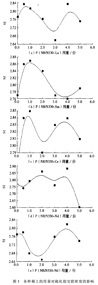 2.1 稀土用量對(duì)硫化膠交聯(lián)密度的影響
