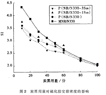 隨著炭黑用量的增加,炭黑在交聯(lián)網(wǎng)絡(luò)中的比重越來(lái)越大,形成的—[CB—NR]—n三維網(wǎng)絡(luò)密度逐漸增大,交聯(lián)點(diǎn)之間的分子鏈的伸展受到了限制,使得交聯(lián)網(wǎng)絡(luò)的彈性收縮的幅度也慢慢減少,當(dāng)填充量達(dá)到100份時(shí),N330-Sm對(duì)交聯(lián)密度的影響已經(jīng)非常微弱,4種硫化膠的表觀(guān)交聯(lián)密度大小趨于一致。