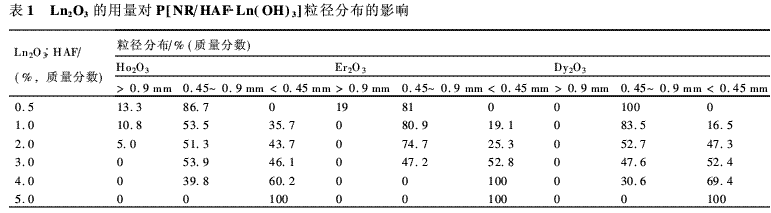 1.稀土可以提高NR膠乳與乳化炭黑構成的粉末體系的成粉率。當Ho, Er的用量為1.0%或Dy的用量為0.5%時,均可使粒徑小于0.9 mm的產(chǎn)物達100%。