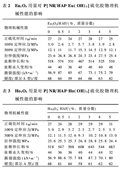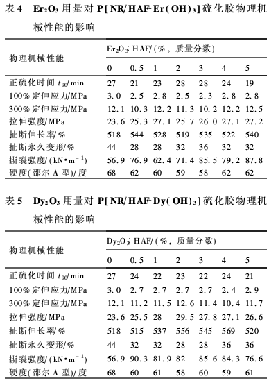 3.稀土可顯著提高P[NR/HAF-Ln(OH)3]硫化膠的拉伸強度和撕裂強度,而Er和Dy還可明顯降低硫化膠的永久變形。其他性能與P(NR/HAF)處于相同水平。